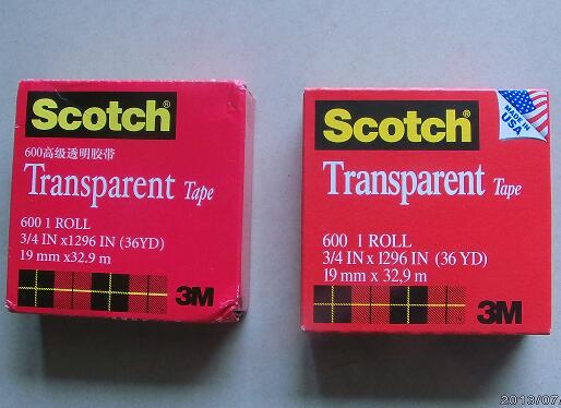 美国3M600胶带有小芯盒装和大芯散装二种,小芯盒装的又分为美国产和上海产二种,美国产包装盒上面是英文还有美国标志,上海产的包装盒上面是中文。